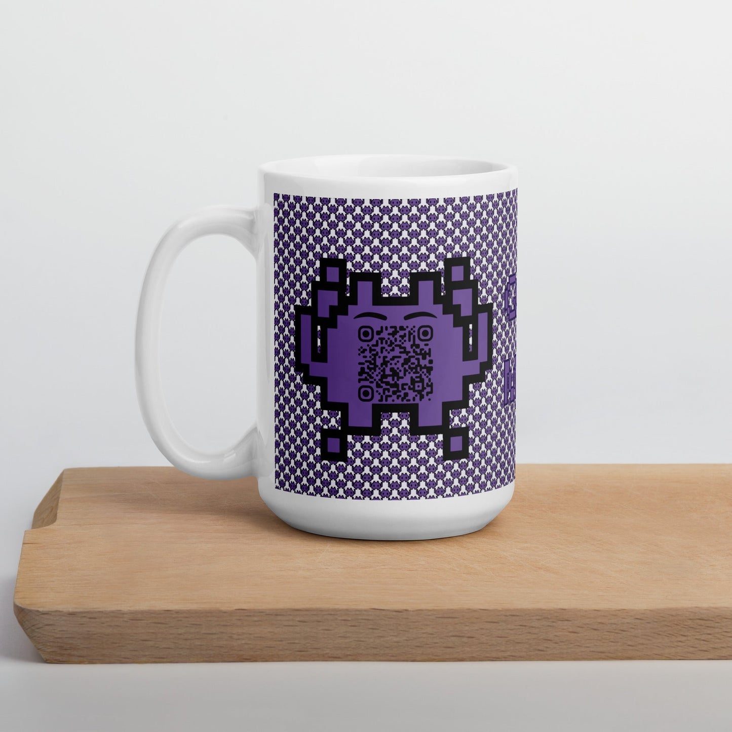 Featuring fun alien emoji art, this mug lets gamers and comic fans share their favorite links or stats by scanning a personalized QR code.