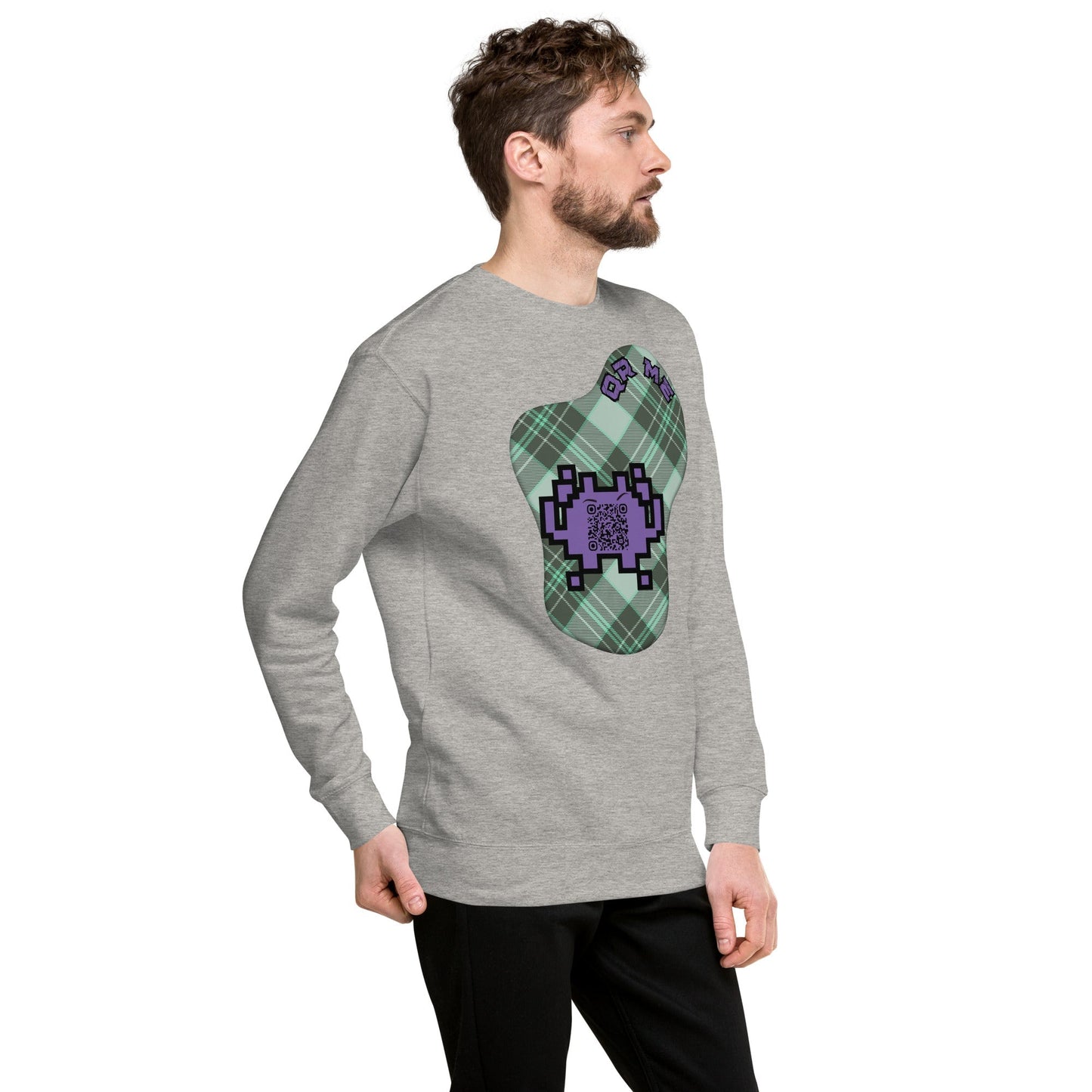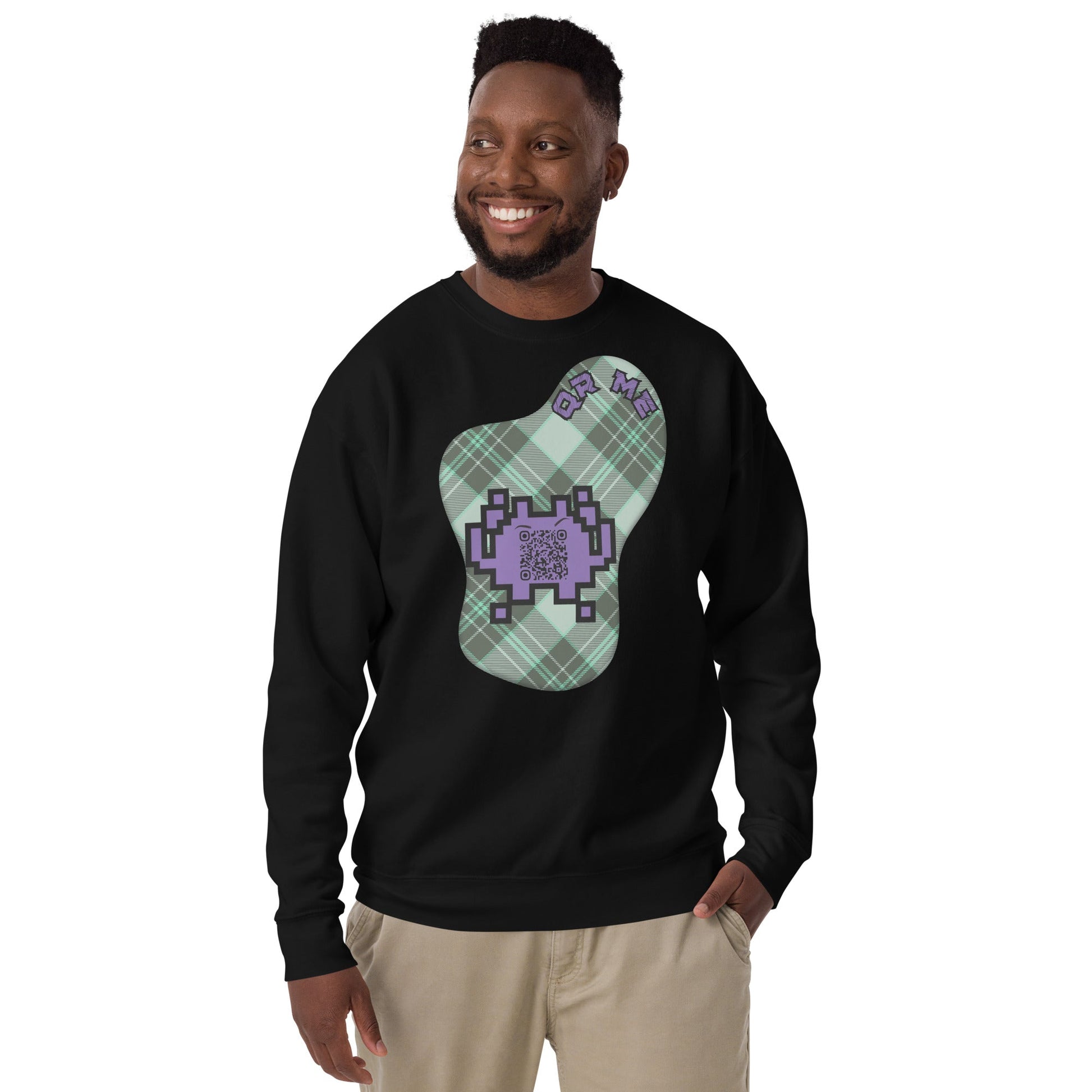 Elevate your style with our personalized QR Code Sweatshirt featuring a playful alien emoji and a subtle hint of plaid.