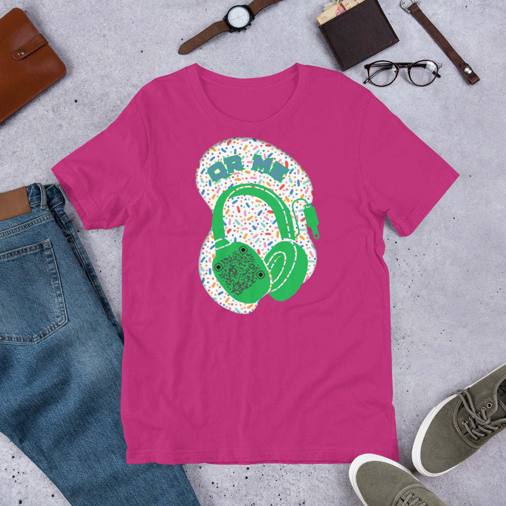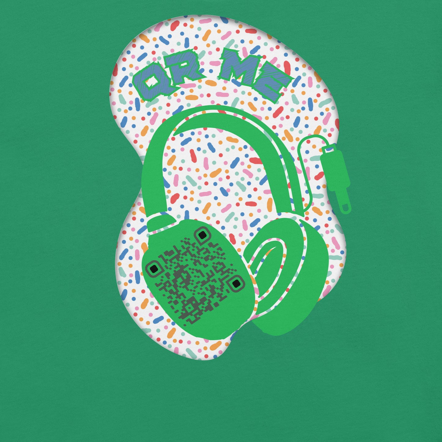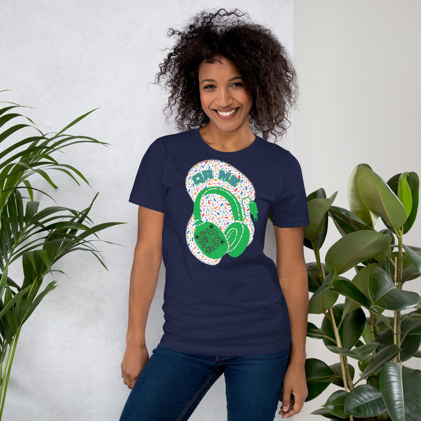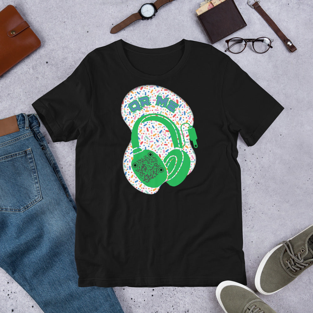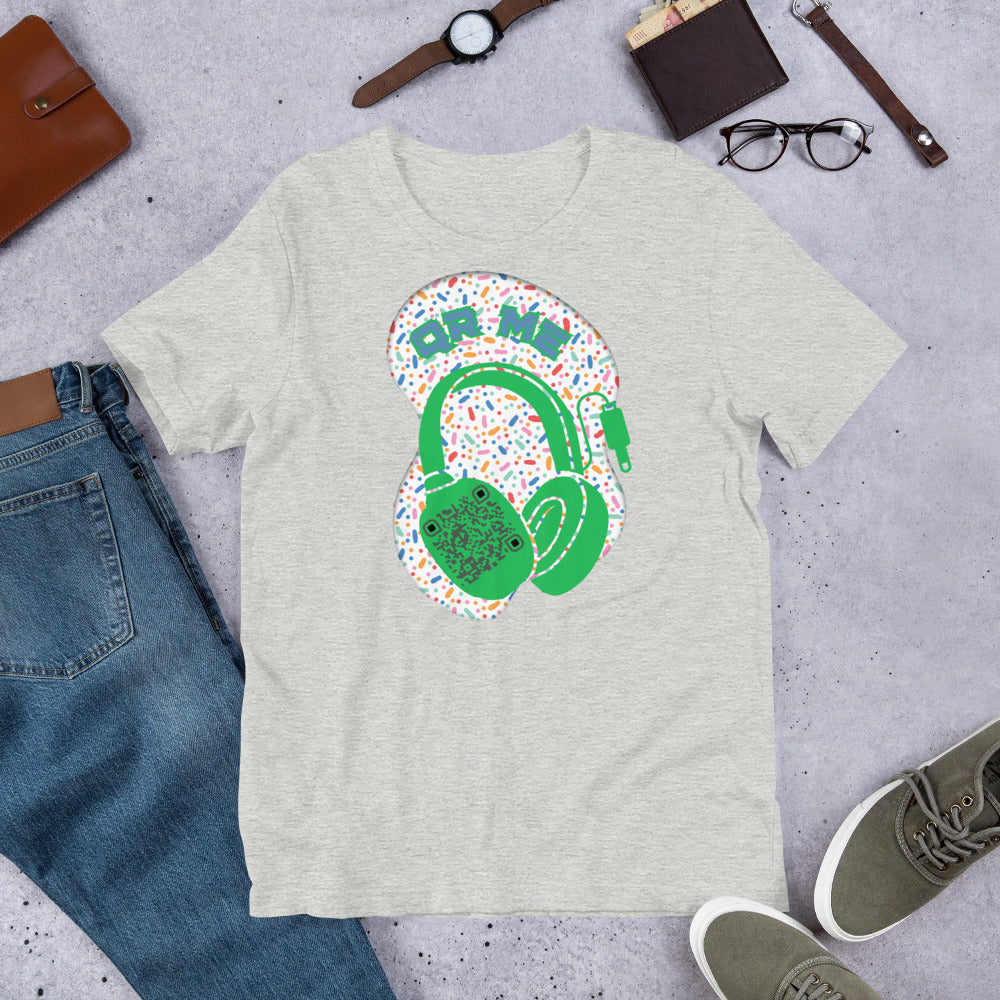 Featuring a playful, vibrant polka dot background, this t-shirt lets you share your music effortlessly by scanning the personalized QR code.